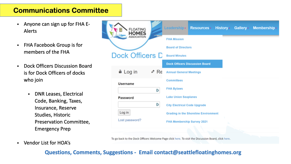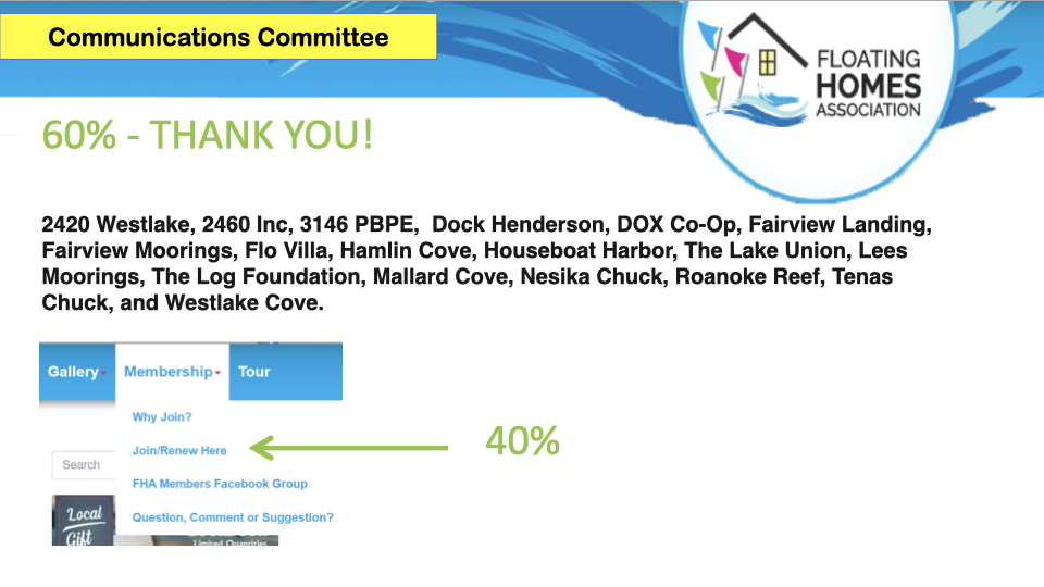 Communications Chair Sarah Morlidge covered membership statistics, 60% of the 510 floating homes are FHA members through their HOA. The other 40% are invited to join as individuals. She reviewed the benefits of membership and features of the FHA website. Sarah explained the the Dock Officers Discussion Board is intended to help docks help each other, but will only succeed if participation increases.