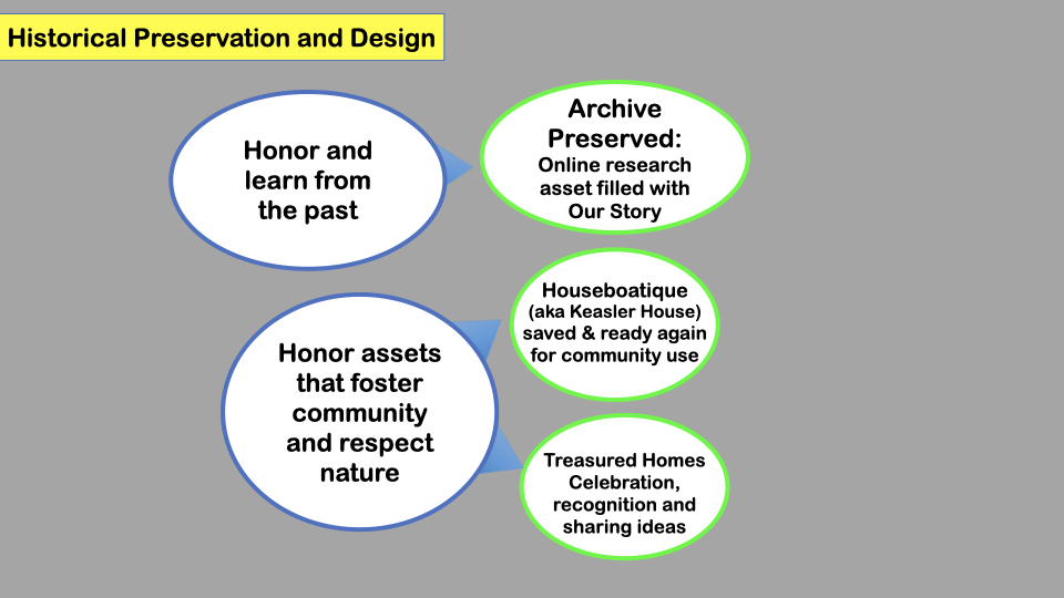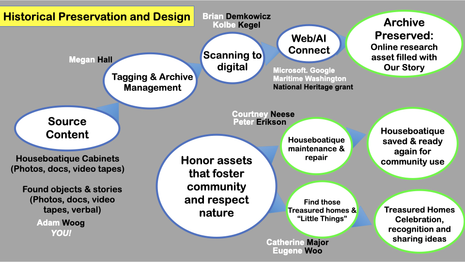 Vice President Stafford Green reviewed his committee on Historical Preservation and Design and how it fits into the FHA mission. His reviewed the efforts underway to archive past documents and also to improve the FHA Houseboatique storage. He showed the plan to honor the rich history of floating boats and the details of making this a reality.