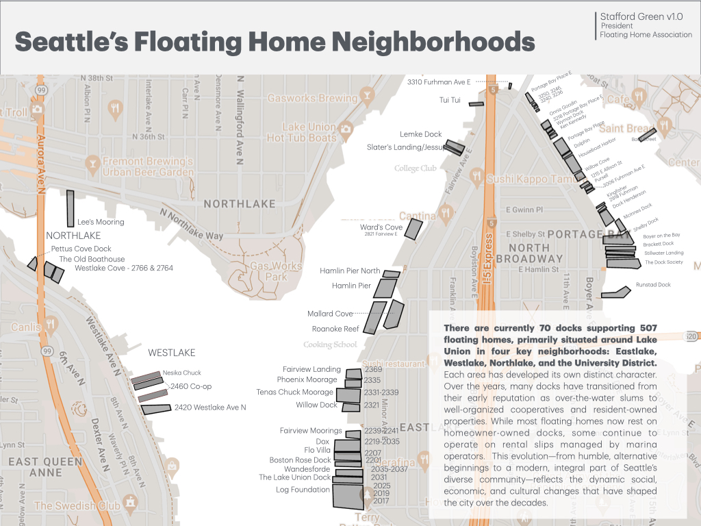 There are currently 70 docks supporting 507 floating homes, primarily situated around Lake Union in four key neighborhoods: Eastlake, Westlake, Northlake, and the University District. Each area has developed its own distinct character. Over the years, many docks have transitioned from their early reputation as over-the-water slums to well-organized cooperatives and resident-owned properties. While most floating homes now rest on homeowner-owned docks, some continue to operate on rental slips managed by marina operators.