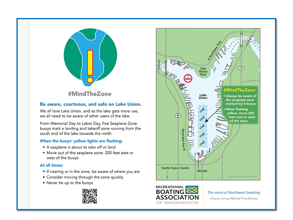 Flashing White Buoys – There is a line of seasonal white buoys that runs north to south in Lake Union to indicate a designated landing strip for floatplanes. The seaplane landing zone on Lake Union is in effect Memorial Day through Labor Day.  When they start flashing it means a floatplane is coming into land. Avoid the buoys when they are flashing. Don’t tie up to these, or the red and green navigational buoys at any time.